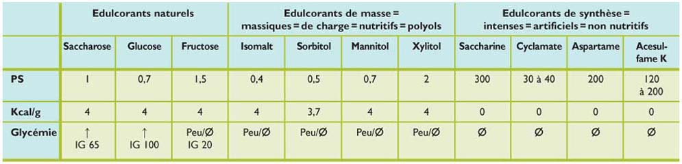 Pour y voir plus clair, voici les différents types d’édulcorants selon leur pouvoir sucrant, leur apport calorique et leur influence sur la glycémie :