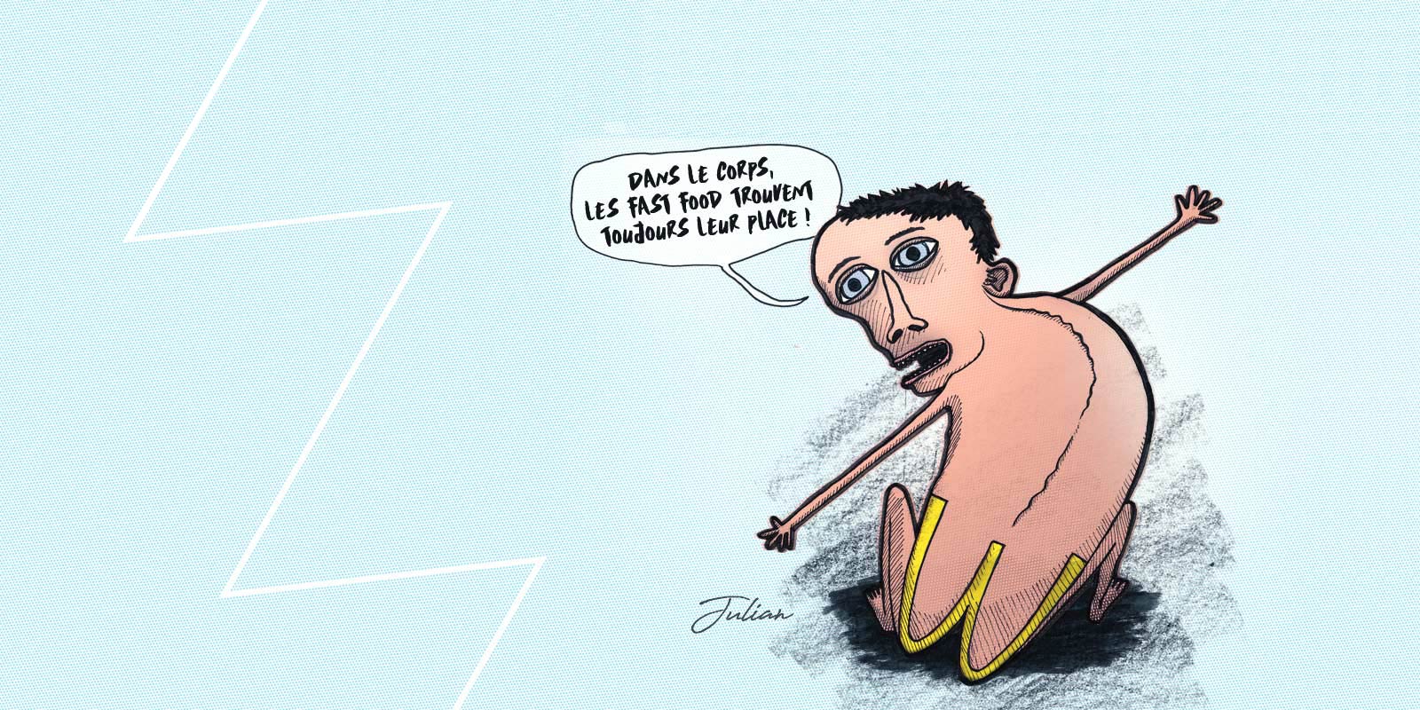Désolé… Ce dessin maladroit n’est pas de très bon goût ! Avec mon inexpérience de l’époque sur la sensibilisation des bonnes pratiques alimentaires, je pensais sincèrement qu’il ferait rire intelligemment les gamins… Heureusement, il n’a pas été retenu !