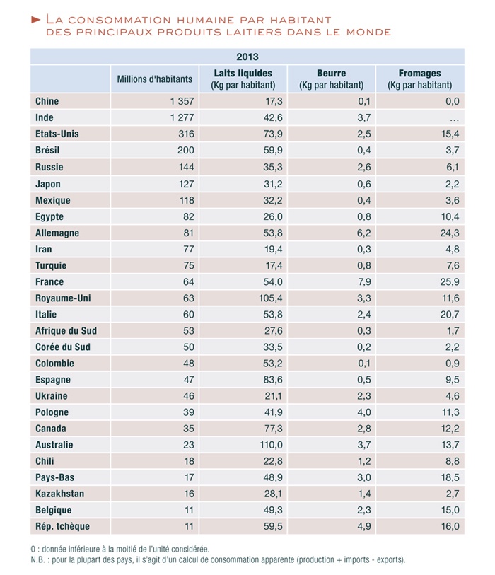 En ce qui concerne les laitages, tous les produits laitiers n’ont pas le même succès. Par exemple, alors que la consommation mondiale de beurre diminue, la consommation de lait et de fromages augmente. Nous les français, sommes de gros consommateurs avec 54 kg de lait, 7,9 kg de beurre et 25,9 kg de fromage consommés chaque année par chaque habitant.